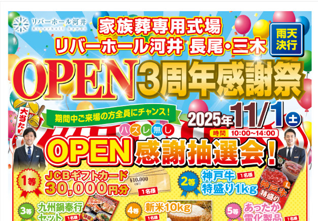こんにちは、リバーホール河井 長尾・三木です。日頃のご愛顧に感謝を込めて、約一年ぶりとなる周年イベントを開催いたします🎉 \リバーホール河井 長尾・三木 OPEN3周年感謝祭/ お子さまから大人の方まで楽しめる催 […]