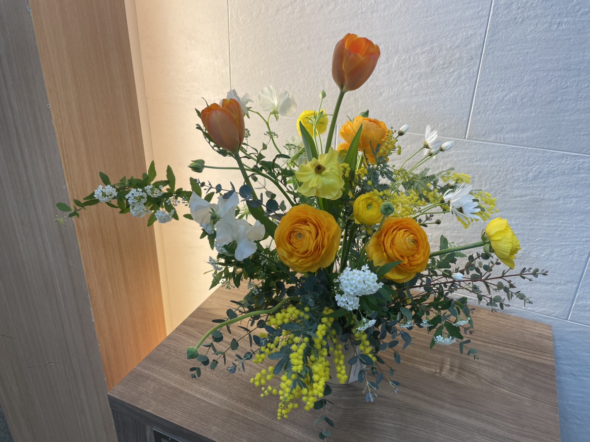 黄色やオレンジ系のグラデーションが可愛らしい、春らしいアレンジメントを作りました🌸