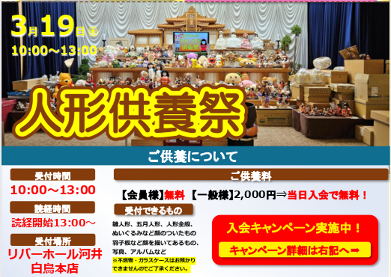 リバーホール河井 白鳥本店では、春の人形供養祭を開催いたします。